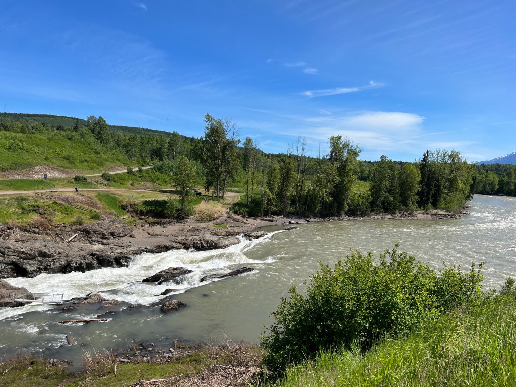 The heat and not the mosquitoes has become more of a problem as northerly progress is being made. For long periods I’d ride with just one hand on my handlebars and my feet on my highway pegs. The views from Houston Canada to Hazelton Canada where we are here for the night are incredible.