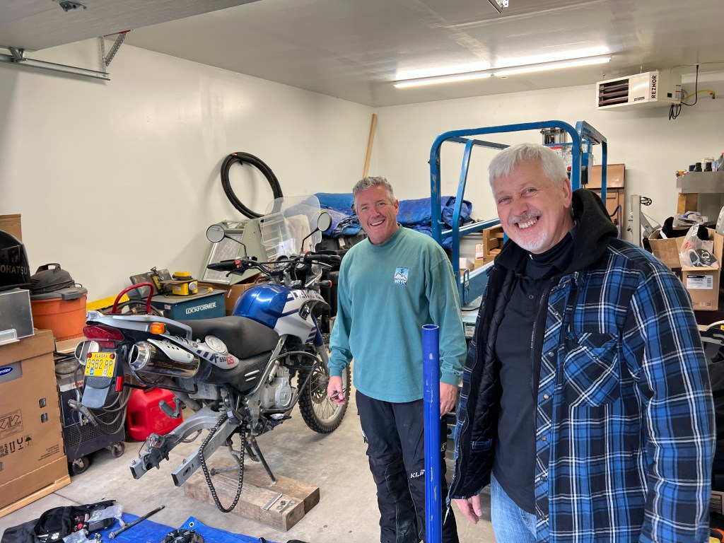 A misplaced vital front tire part fell off and may yet keep him from riding. Tom was able to pull out a box of spare spacers, one that fit nicely, except that it was too wide. Non of the others matched up so, it was now up to Deckland to take a grinder to it, to make it work. What could possibly go wrong with that scenario. Well for one my wife would say; that’s far too dangerous to do; he should wait for the motorcycle shop to open so he can purchase a proper set. And perhaps as always, she may be right. We’re in Anchorage and still haven’t seen him or Brian.