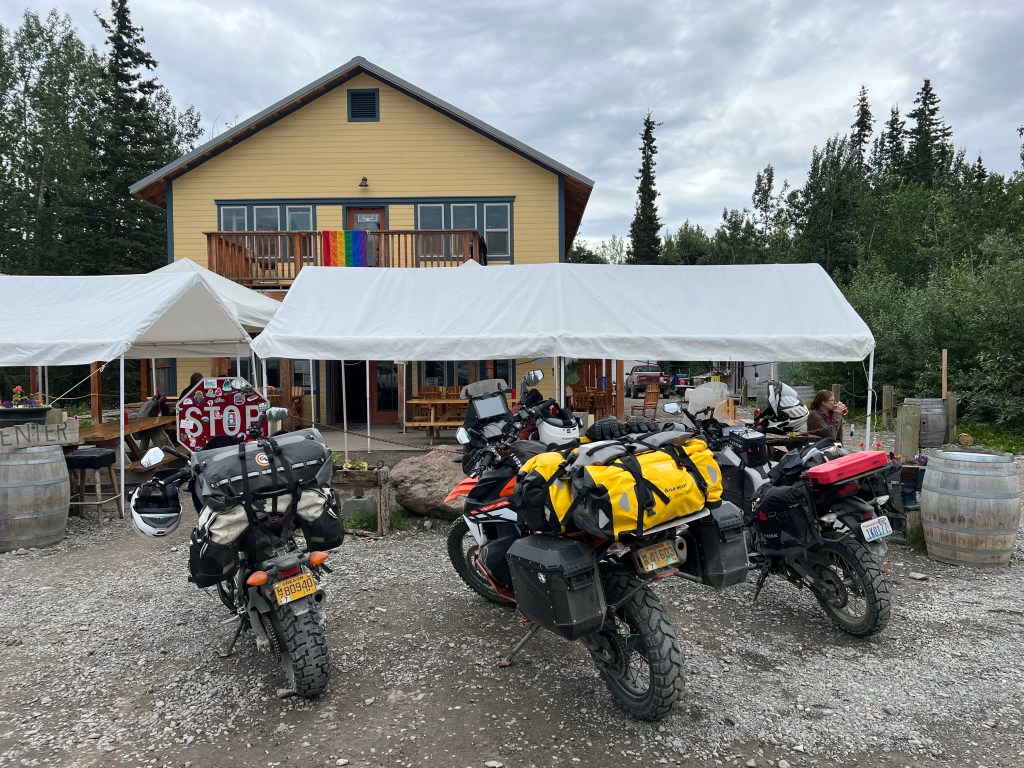 This morning I thought I was the first one up, until I found Alaska Todd upstairs with the television on but muted; watching what else but, you guessed it, dirt bike racing around a track. And then I proceeded to make coffee. I offered him a cup and soon everything was right with his world again. And today a new rider joins us. He arrived late last night taking that Thompson pass and those roads we traveled through to get here at night; what am I talking about. It never gets dark. Just colder and wetter as it is now raining. Spencer is from Alaska and from recent conversations I gather that he’s extremely knowledgeable about our entire route planning, as Todd says, he’s mostly the one who put it all together. Spencer also told me that once we get to the Wrangel-St Elias area he says it’s what people think; when they think Alaska. Some of the most beautiful places in the world. You decide.