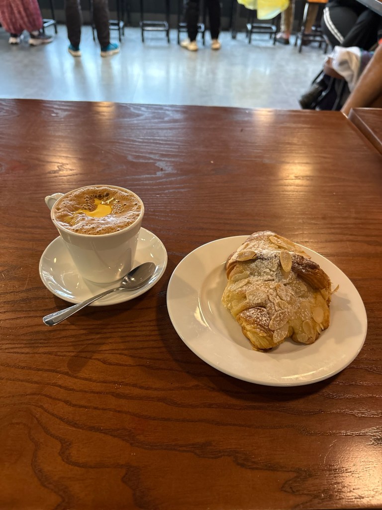 While the foam settled, I snapped a photo for my wife in Texas now affected by the government shut down whereby she needed to take a taxi to complete the last leg of her journey. Her reply: a photo ofchips, salsa, white wine that likely cost more than my week here. I fired back a photo of a delicious almond croissant and egg coffee. Eye-roll emoji. Fair.