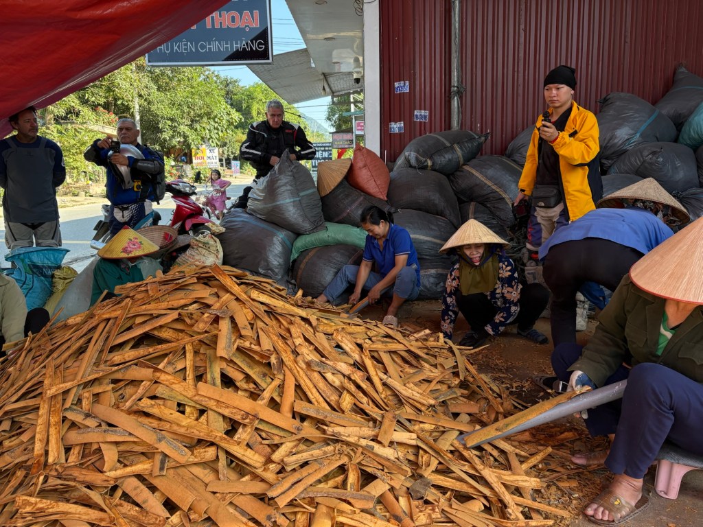 In a low-roofed shed, eight women peeled in steady cadence. Fresh cinnamon logs—straight, pale—piled like cords. Cross-legged on floor or stool, curved blades spiraled bark into damp ribbons curling like scrolls.