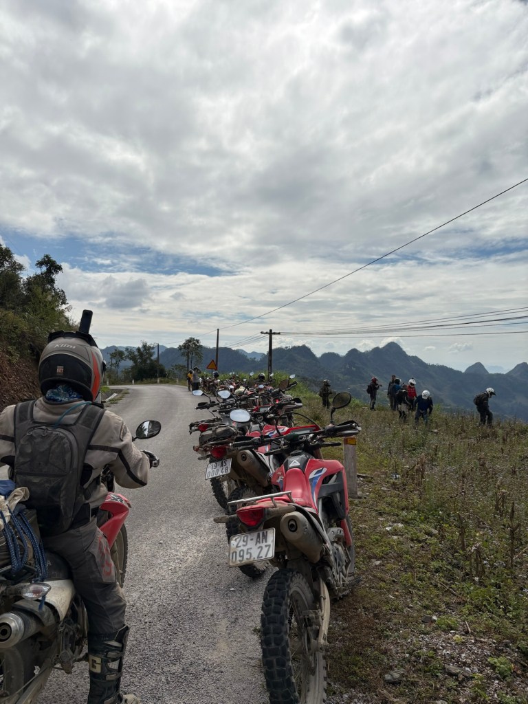 Kim’s already clocked the construction zone ahead—fresh asphalt still steaming, both lanes choked with idling trucks and scooters. Dead stop. Back at the construction berm—three feet of vertical dirt, warm from the morning sun—Kim kills the engine, plants a boot, surveys the scene like a general. Without a word, he walks his bike up, rear tire spinning, knocking the edge down with every push until the mound slumps into a gentle ramp. My several-days-ago brand-new 300 tiptoes over the fresh-cut berm like I’m a pro rider; the veterans just gun it and laugh.