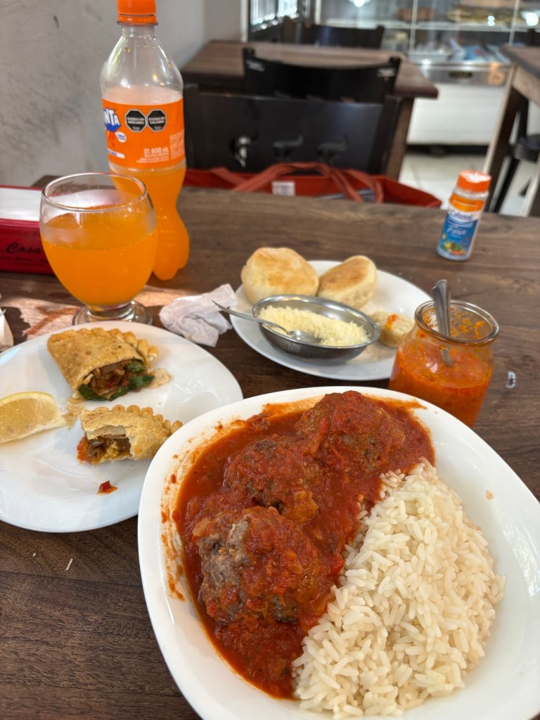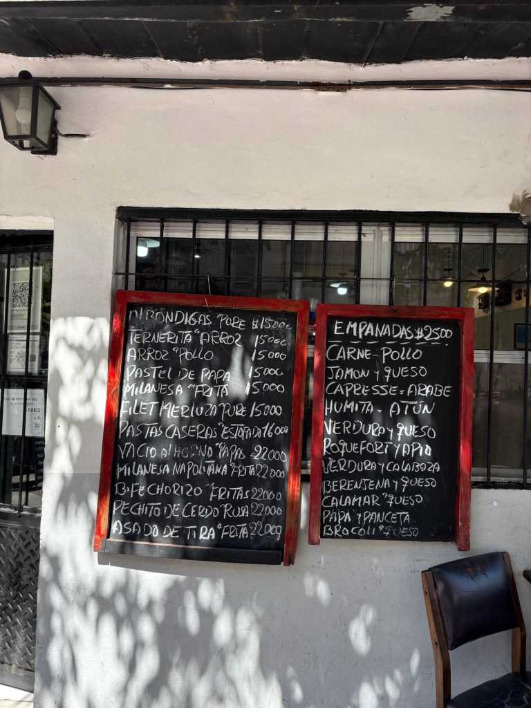 The café felt like a local Cheers—warm hello the second I stepped in. First customer. Café con leche, croissant, and a small complimentary shot that tasted like a brighter, slightly different orange juice. Delicious either way. Total: 5,950 pesos, roughly $4.30 USD. Not street-mate cheap, but far from tourist gouging.