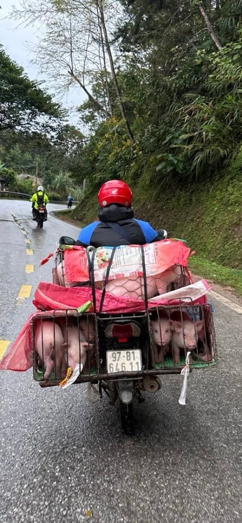 Traffic was its own language. Trucks passed on blind curves like they owned the road. Buses claimed the centerline, horns blaring. Scooters wove with impossible loads. Chickens scattered. Ducks waddled. Dogs slept in the middle. We saw cattle, a goat, a toddler wandering alone. And yes—a pig, wooden yoke around its neck, trotting toward freedom.