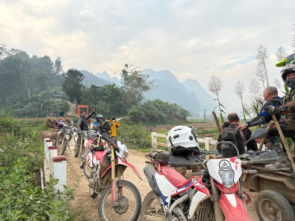 Then: riverbed rally. Tires kicked sand, water arcing behind. We stopped mid-stream, engines ticking, sky clearing to pale blue. Kids on the banks went wild—“Xin chào!” High-fives all around. Villages erupted as we rolled through, muddy and grinning. Smiles don’t need translation.